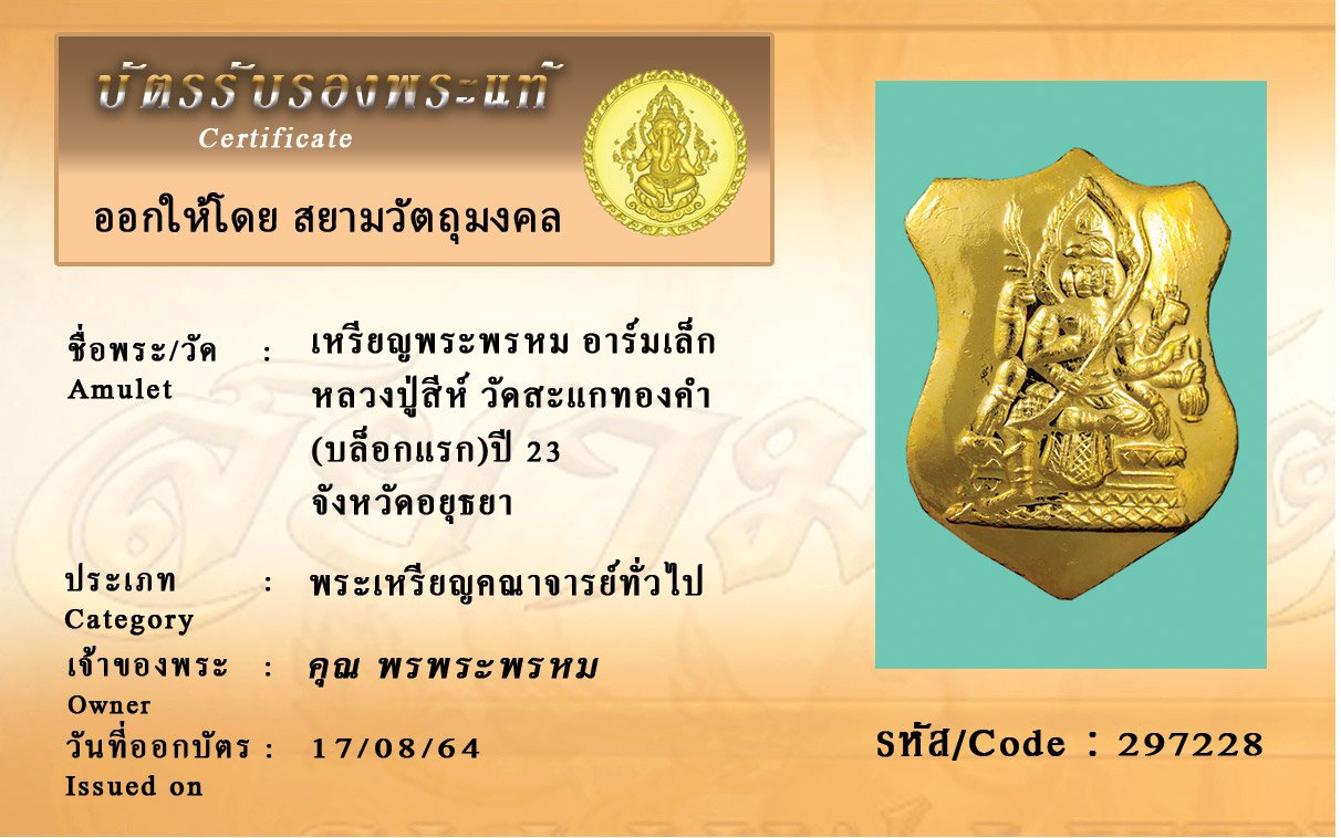 รหัสสินค้า : 297228 เหรียญพระพรหม อาร์มเล็ก หลวงปู่สีห์ วัดสะแกทองคำ (บล็อกแรก)ปี 23 จังหวัดอยุธยา
