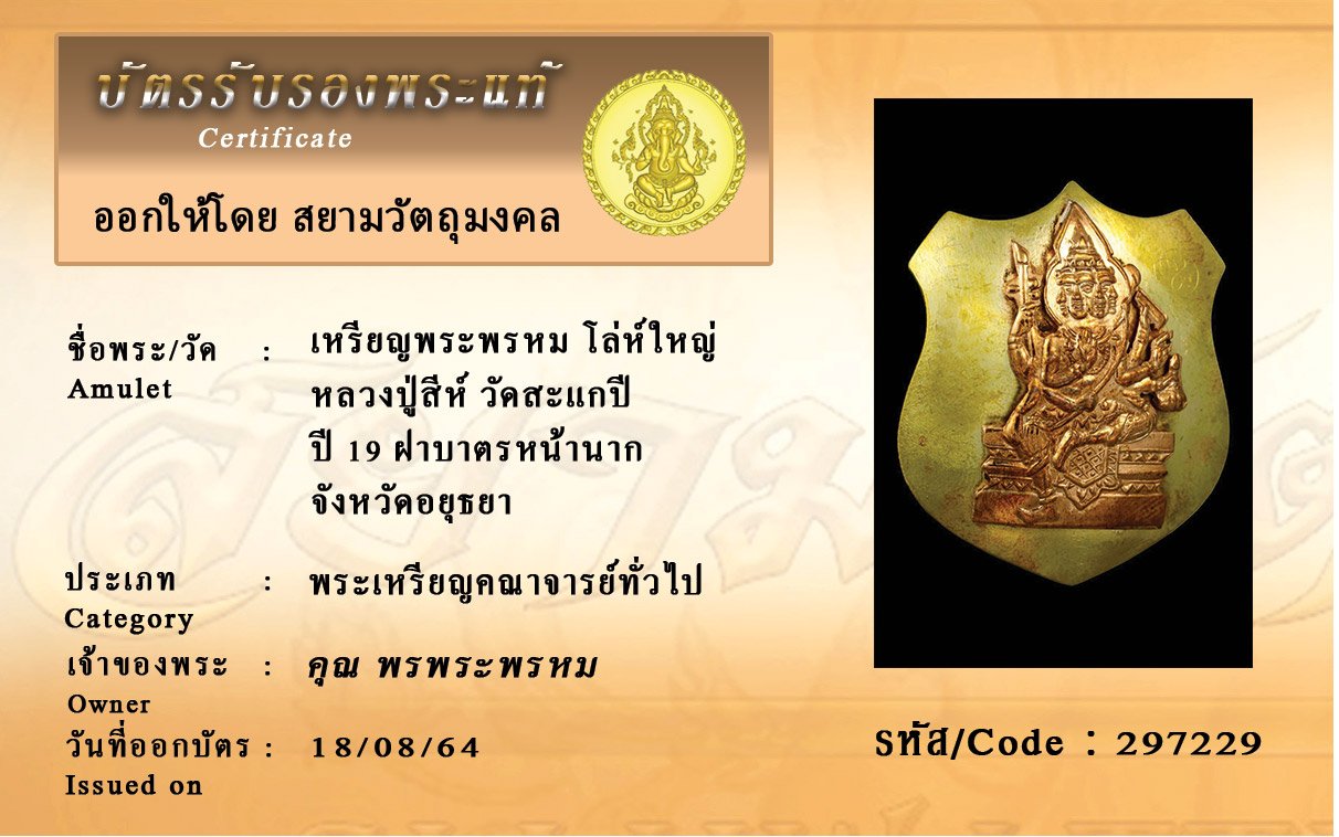 รหัสสินค้า : 297229 เหรียญพระพรหม โล่ห์ใหญ่ หลวงปู่สีห์ วัดสะแกปี ปี 19 ฝาบาตรหน้านาก จังหวัดอยุธยา