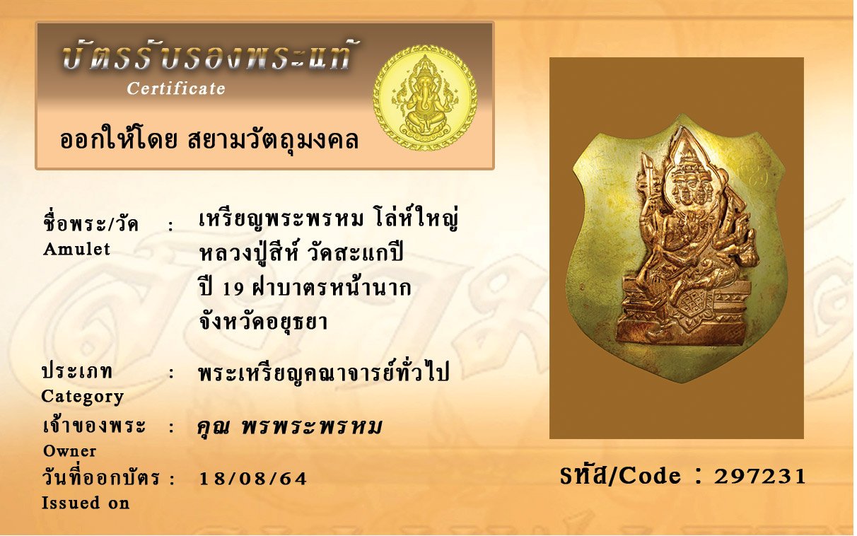 รหัสสินค้า : 297231 เหรียญพระพรหม โล่ห์ใหญ่ หลวงปู่สีห์ วัดสะแกปี ปี 19 ฝาบาตรหน้านาก จังหวัดอยุธยา