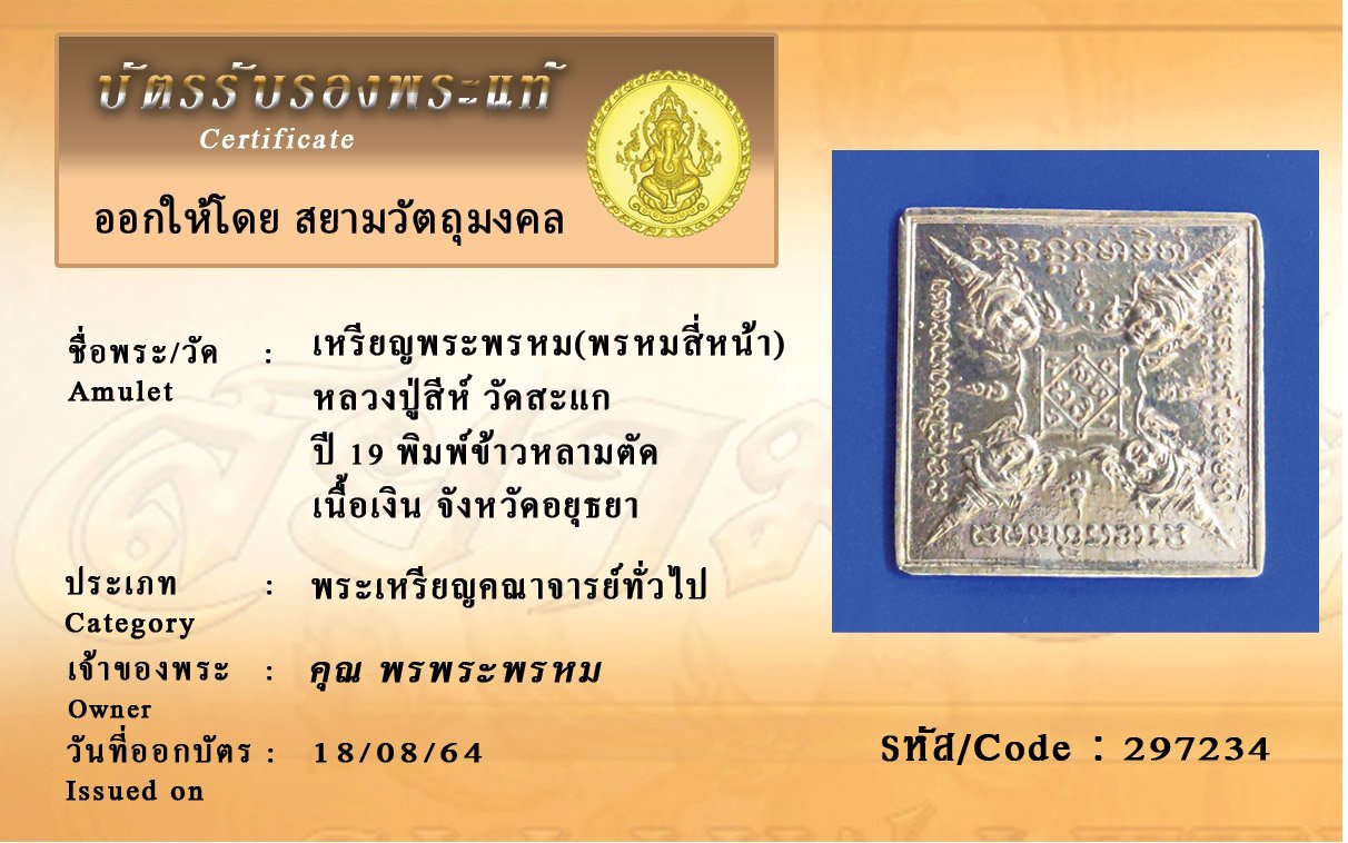 รหัสสินค้า : 297234 เหรียญพระพรหม(พรหมสี่หน้า) หลวงปู่สีห์ วัดสะแก ปี 19 พิมพ์ข้าวหลามตัด เนื้อเงิน จังหวัดอยุธยา
