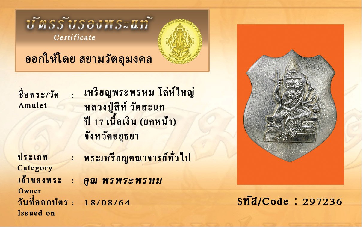 รหัสสินค้า : 297236 เหรียญพระพรหม โล่ห์ใหญ่ หลวงปู่สีห์ วัดสะแก ปี 17 เนื้อเงิน (ยกหน้า) จังหวัดอยุธยา
