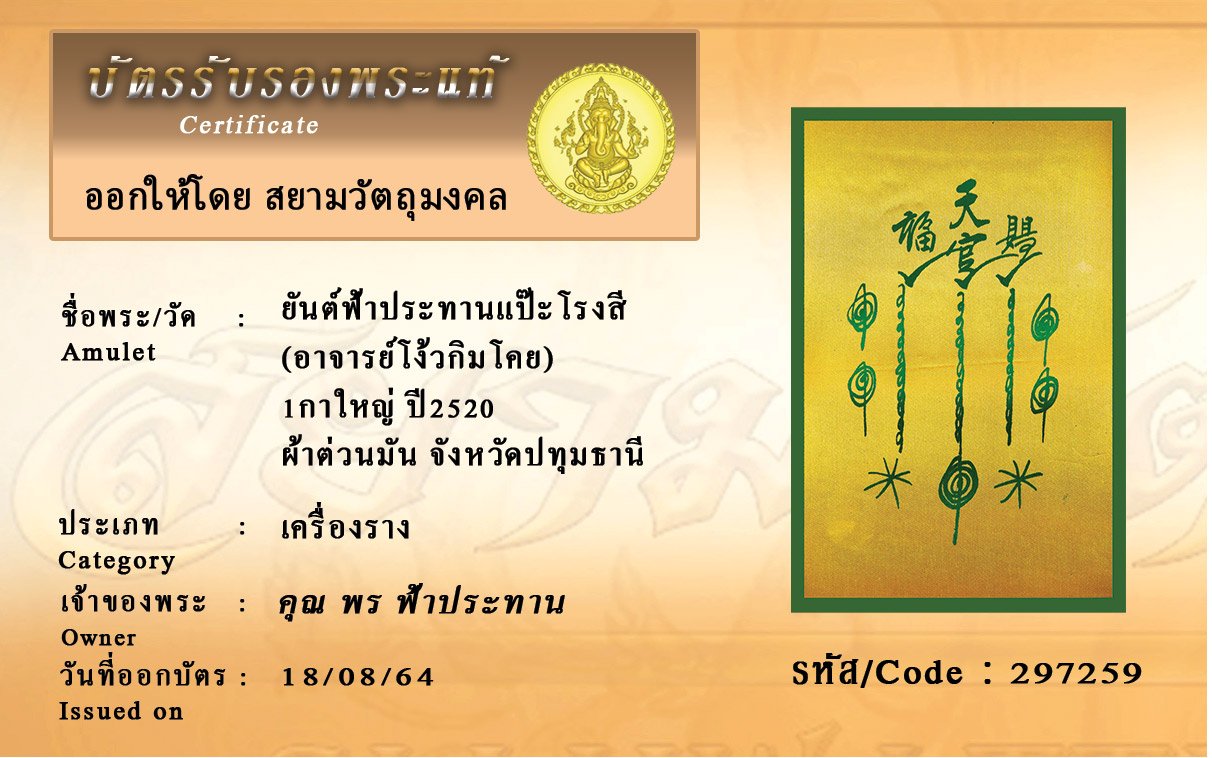 รหัสสินค้า : 297259 ยันต์ฟ้าประทานแป๊ะโรงสี (อาจารย์โง้วกิมโคย) 1กาใหญ่ ปี2520 ผ้าต่วนมัน จังหวัดปทุมธานี