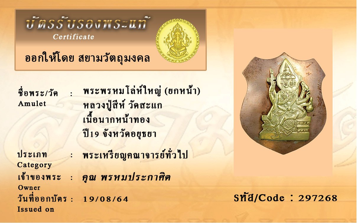 รหัสสินค้า : 297268 พระพรหมโล่ห์ใหญ่ (ยกหน้า) หลวงปู่สีห์ วัดสะแก เนื้อนากหน้าทอง ปี19 จังหวัดอยุธยา