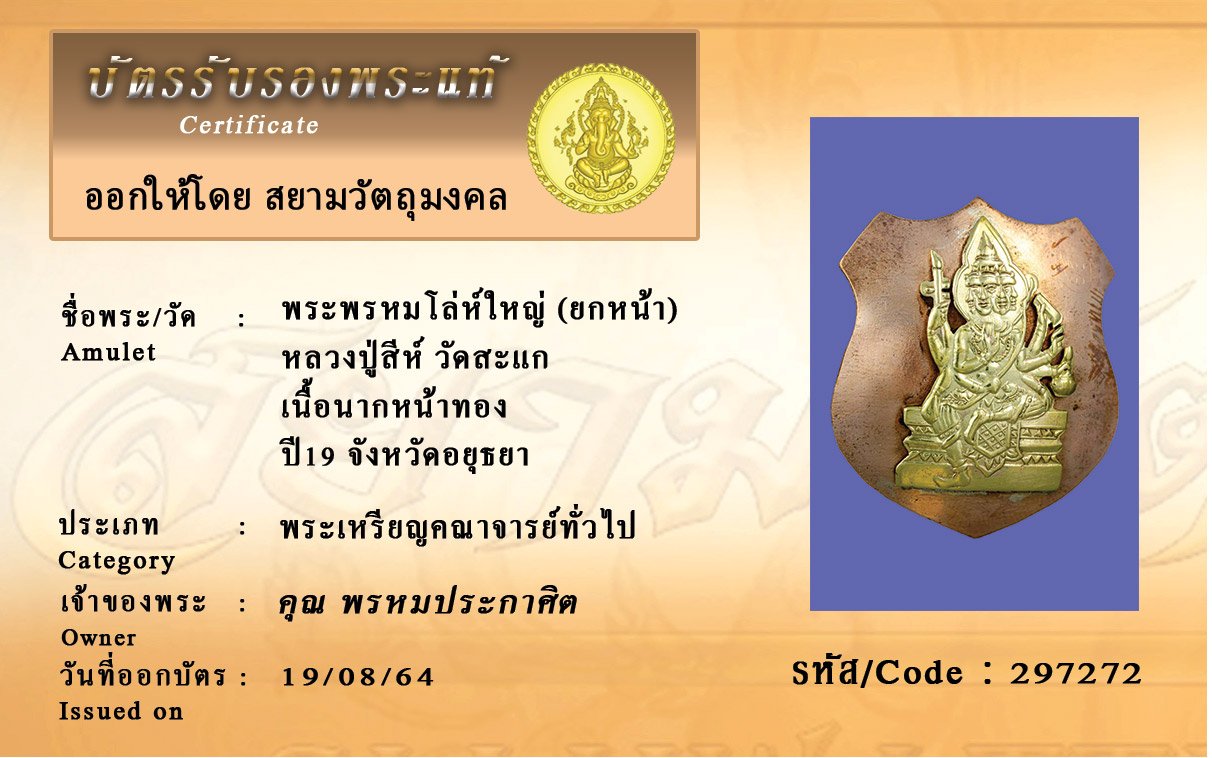 รหัสสินค้า : 297272 พระพรหมโล่ห์ใหญ่ (ยกหน้า) หลวงปู่สีห์ วัดสะแก เนื้อนากหน้าทอง ปี19 จังหวัดอยุธยา