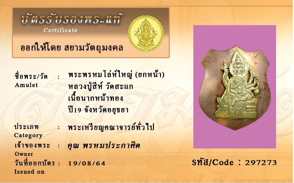 รหัสสินค้า : 297273 พระพรหมโล่ห์ใหญ่ (ยกหน้า) หลวงปู่สีห์ วัดสะแก เนื้อนากหน้าทอง ปี19 จังหวัดอยุธยา