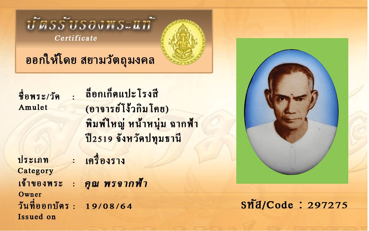 รหัสสินค้า : 297275 ล็อกเก็ตแปะโรงสี (อาจารย์โง้วกิมโคย) พิมพ์ใหญ่ หน้าหนุ่ม ฉากฟ้า ปี2519 จังหวัดปทุมธานี