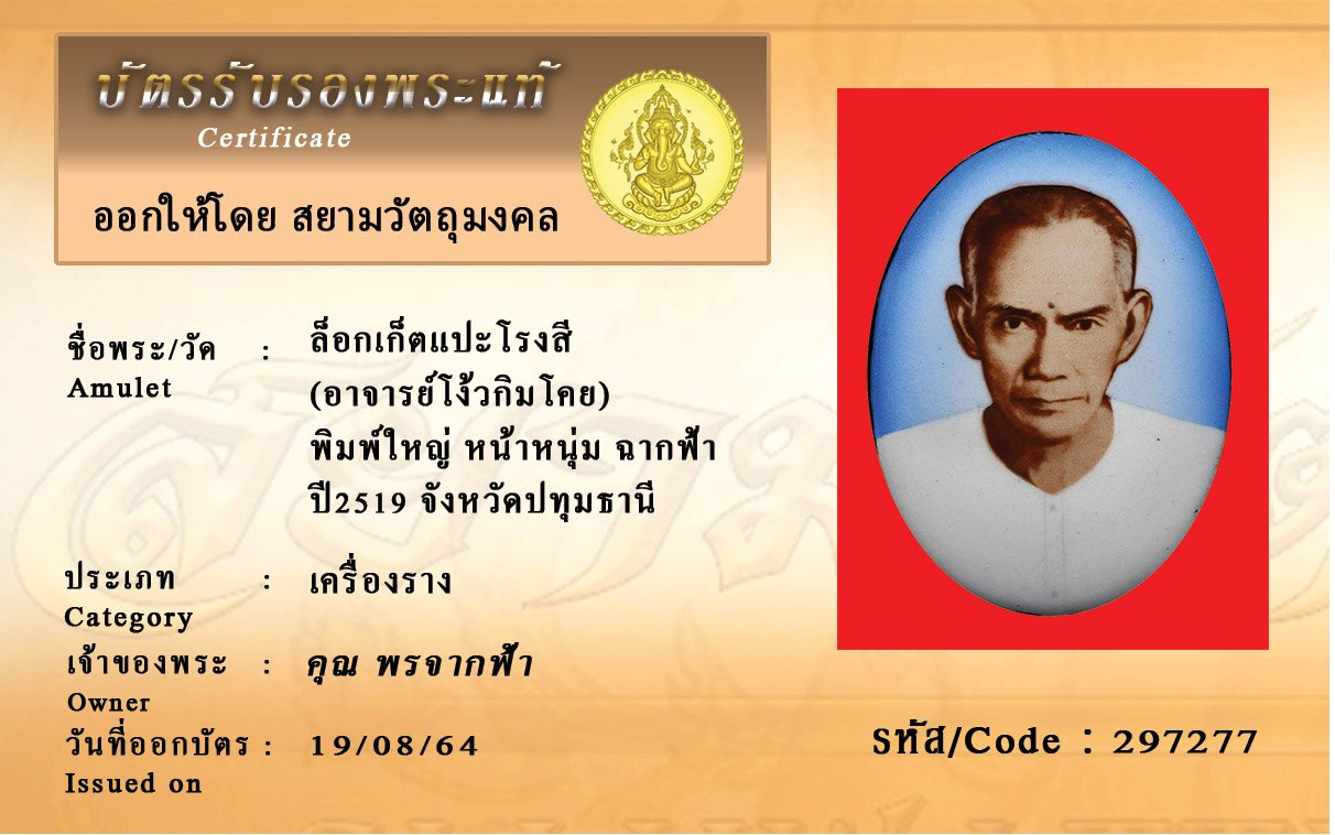 รหัสสินค้า : 297277 ล็อกเก็ตแปะโรงสี (อาจารย์โง้วกิมโคย) พิมพ์ใหญ่ หน้าหนุ่ม ฉากฟ้า ปี2519 จังหวัดปทุมธานี
