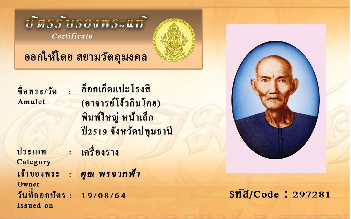 รหัสสินค้า : 2972781 ล็อกเก็ตแปะโรงสี (อาจารย์โง้วกิมโคย) พิมพ์ใหญ่ หน้าเล็ก ปี2519 จังหวัดปทุมธานี