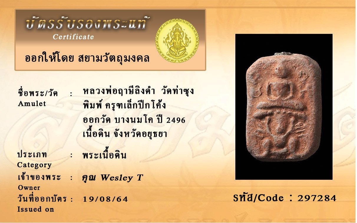 รหัสสินค้า : 297284 หลวงพ่อฤาษีลิงดำ วัดท่าซุง พิมพ์ ครุฑเล็กปีกโค้ง ออกวัด บางนมโค ปี 2496 เนื้อดิน จังหวัดอยุธยา