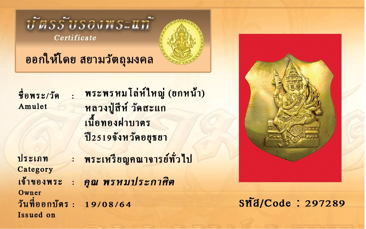 รหัสสินค้า : 297289 พระพรหมโล่ห์ใหญ่ (ยกหน้า) หลวงปู่สีห์ วัดสะแก เนื้อทองฝาบาตร ปี2519จังหวัดอยุธยา