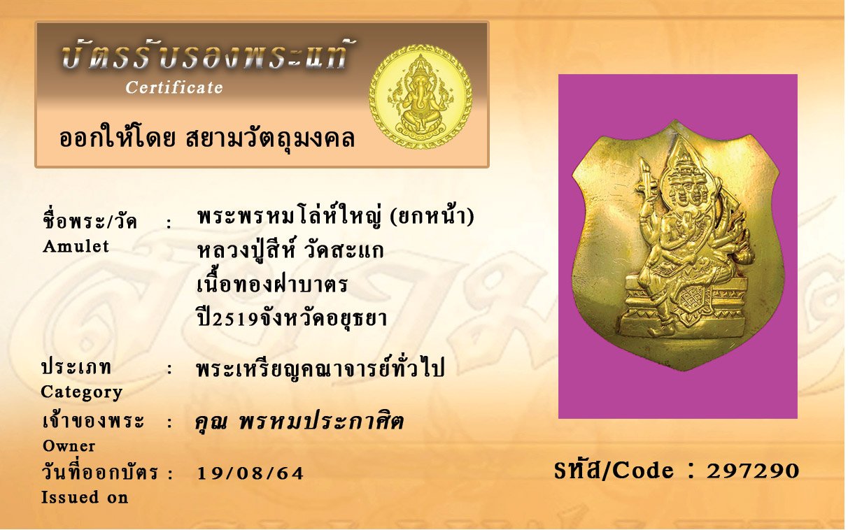 รหัสสินค้า : 297290 พระพรหมโล่ห์ใหญ่ (ยกหน้า) หลวงปู่สีห์ วัดสะแก เนื้อทองฝาบาตร ปี2519จังหวัดอยุธยา