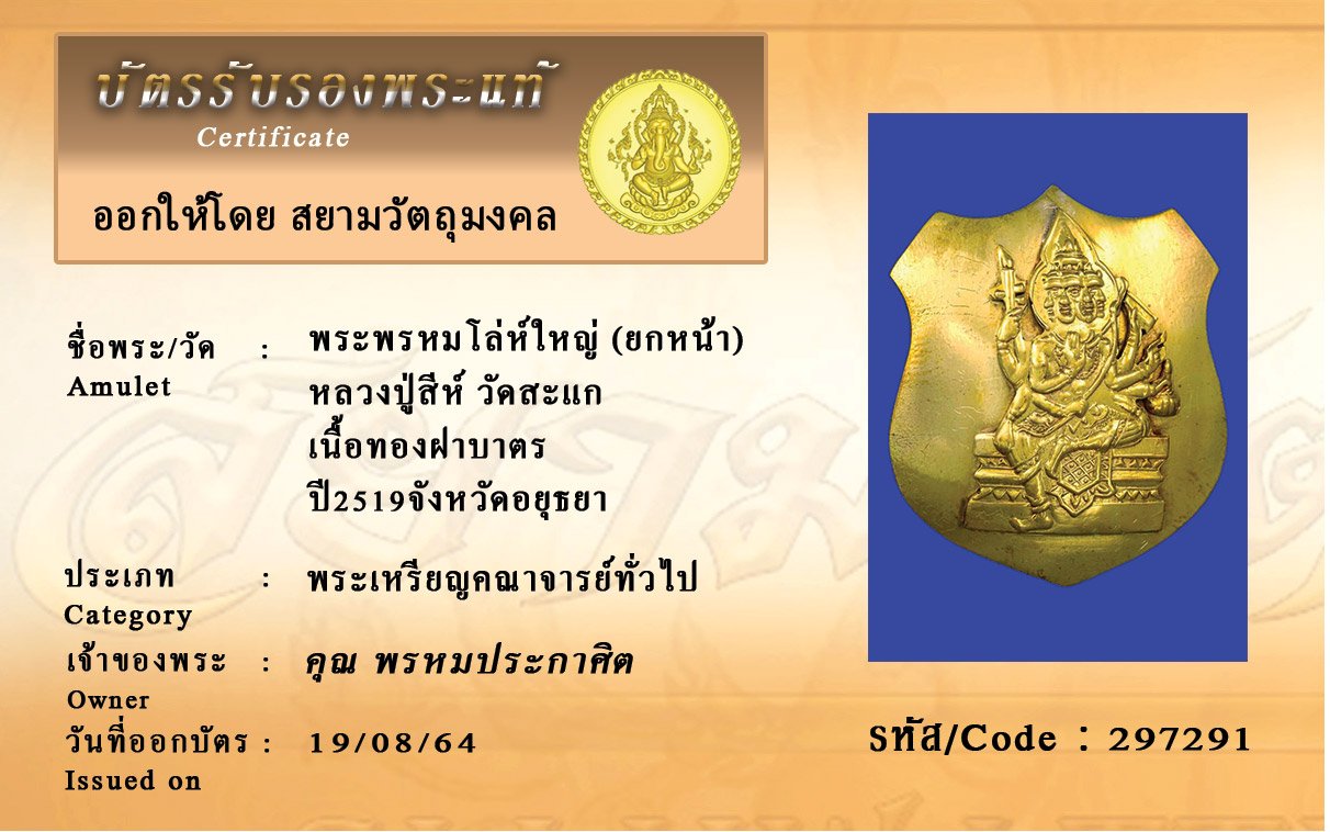 รหัสสินค้า : 297291 พระพรหมโล่ห์ใหญ่ (ยกหน้า) หลวงปู่สีห์ วัดสะแก เนื้อทองฝาบาตร ปี2519จังหวัดอยุธยา