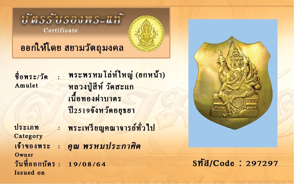 รหัสสินค้า : 297297 พระพรหมโล่ห์ใหญ่ (ยกหน้า) หลวงปู่สีห์ วัดสะแก เนื้อทองฝาบาตร ปี2519จังหวัดอยุธยา