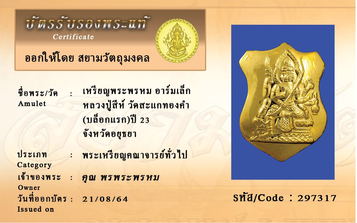 รหัสสินค้า : 297317 เหรียญพระพรหม อาร์มเล็ก หลวงปู่สีห์ วัดสะแกทองคำ (บล็อกแรก)ปี 23 จังหวัดอยุธยา