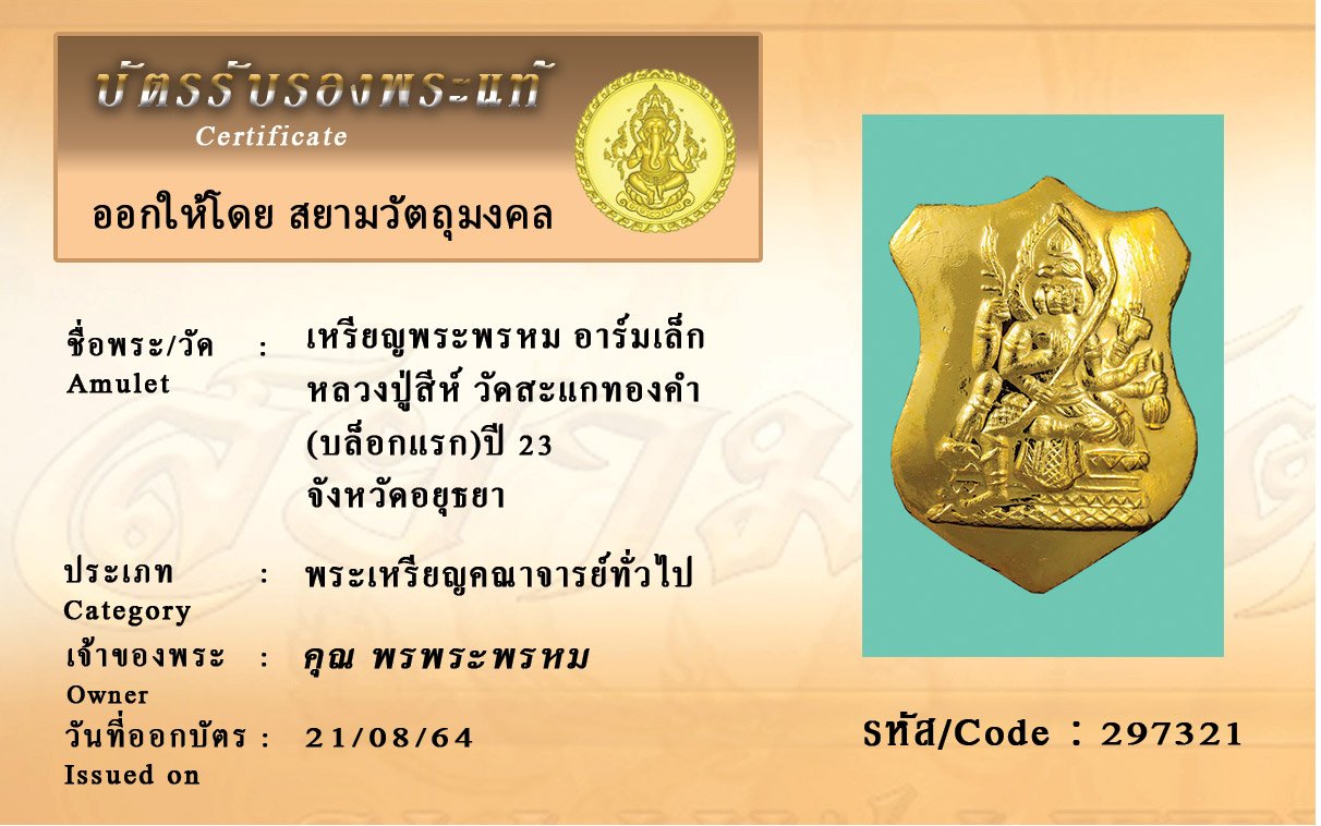 รหัสสินค้า : 297321 เหรียญพระพรหม อาร์มเล็ก หลวงปู่สีห์ วัดสะแกทองคำ (บล็อกแรก)ปี 23 จังหวัดอยุธยา