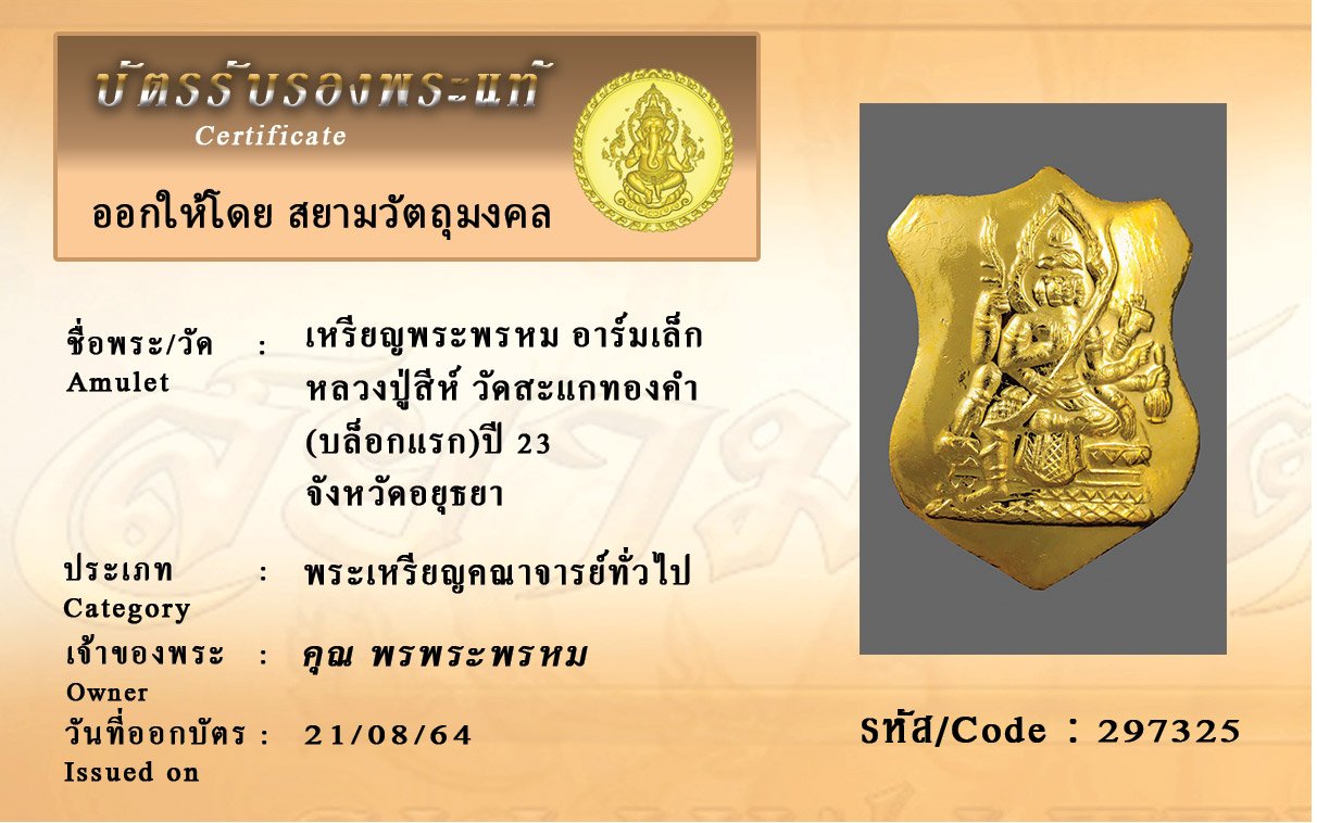 รหัสสินค้า : 297325 เหรียญพระพรหม อาร์มเล็ก หลวงปู่สีห์ วัดสะแกทองคำ (บล็อกแรก)ปี 23 จังหวัดอยุธยา