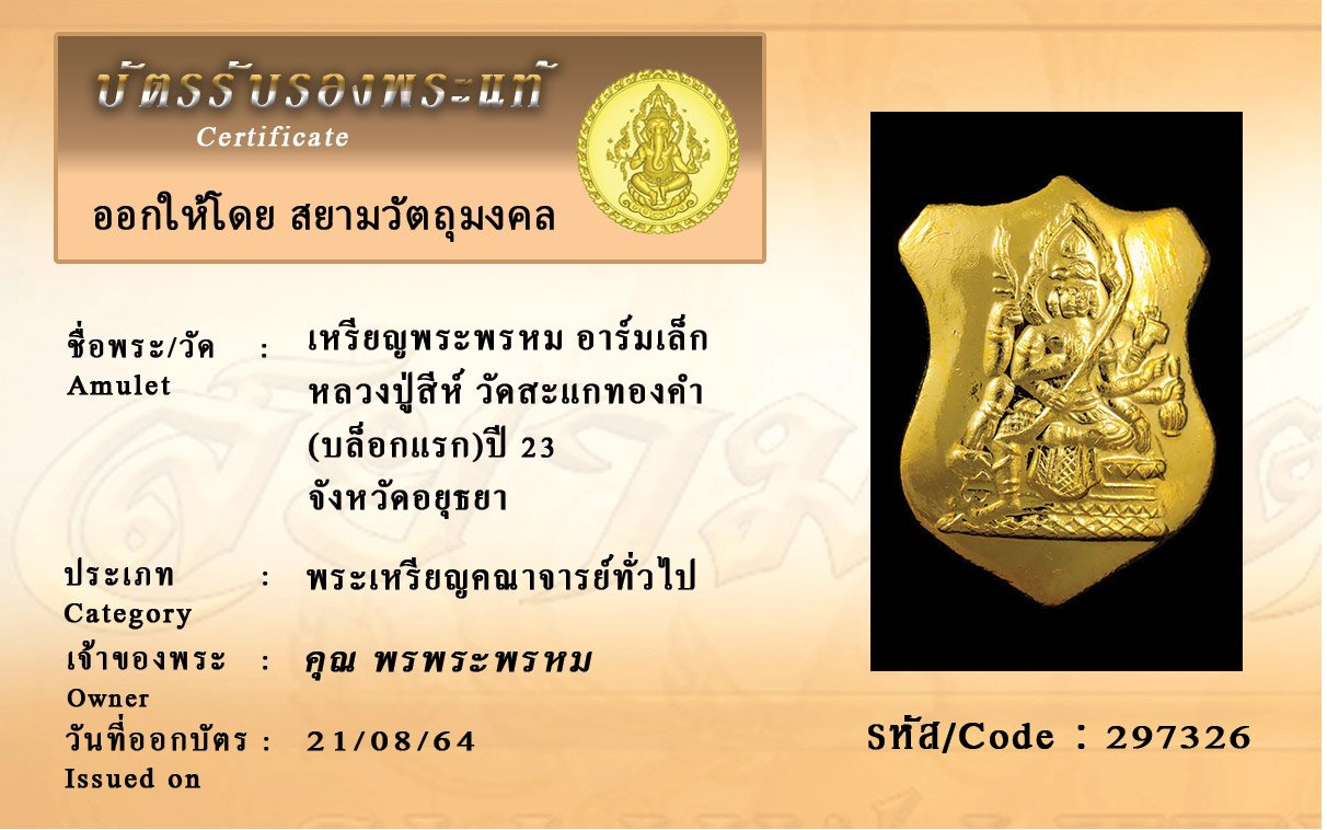 รหัสสินค้า : 297326 เหรียญพระพรหม อาร์มเล็ก หลวงปู่สีห์ วัดสะแกทองคำ (บล็อกแรก)ปี 23 จังหวัดอยุธยา