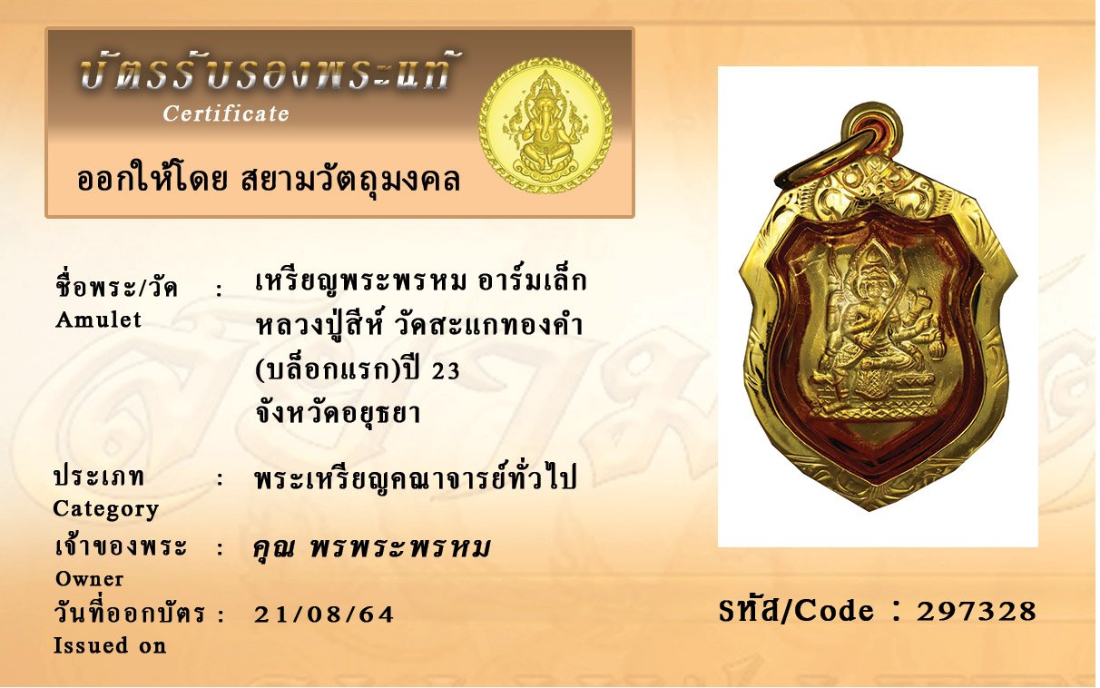 รหัสสินค้า : 297328 เหรียญพระพรหม อาร์มเล็ก หลวงปู่สีห์ วัดสะแกทองคำ (บล็อกแรก)ปี 23 จังหวัดอยุธยา