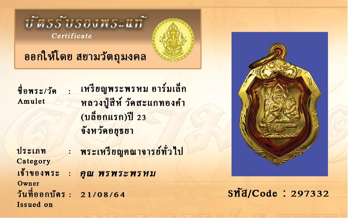 รหัสสินค้า : 297332 เหรียญพระพรหม อาร์มเล็ก หลวงปู่สีห์ วัดสะแกทองคำ (บล็อกแรก)ปี 23 จังหวัดอยุธยา