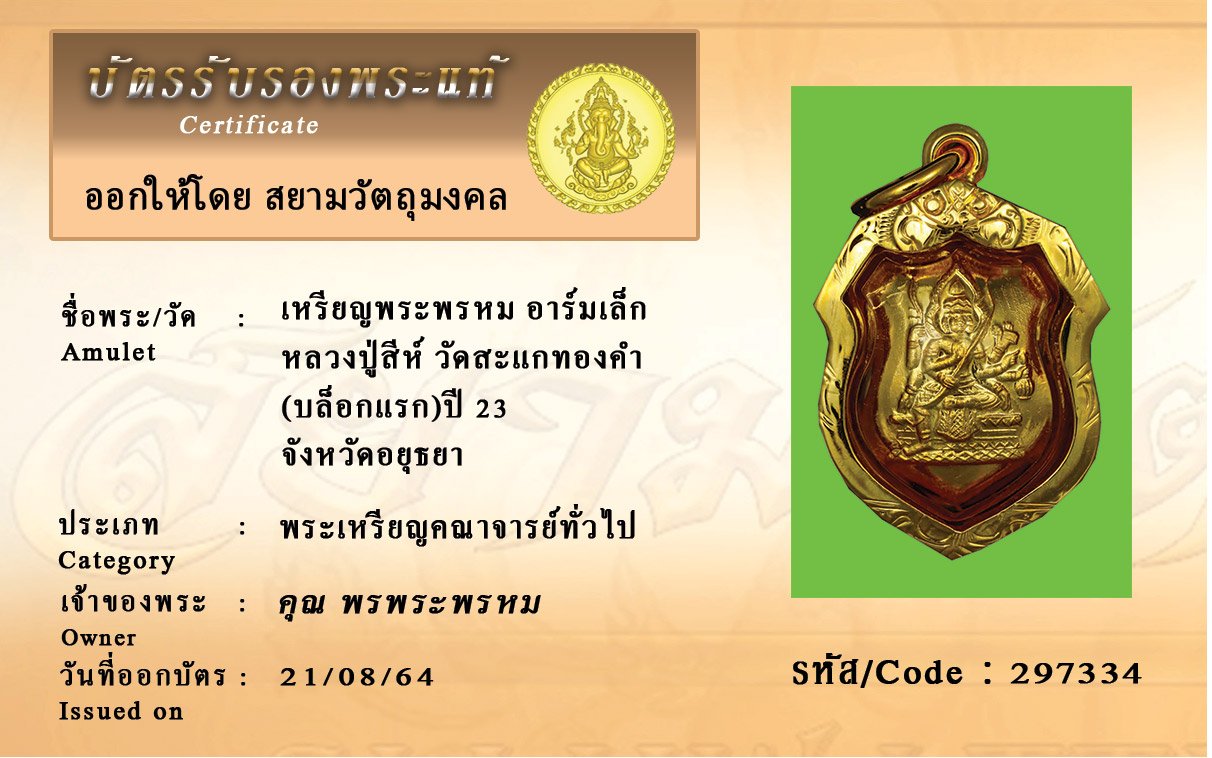 รหัสสินค้า : 297334 เหรียญพระพรหม อาร์มเล็ก หลวงปู่สีห์ วัดสะแกทองคำ (บล็อกแรก)ปี 23 จังหวัดอยุธยา
