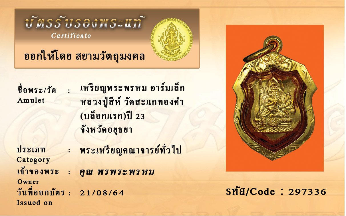 รหัสสินค้า : 297336 เหรียญพระพรหม อาร์มเล็ก หลวงปู่สีห์ วัดสะแกทองคำ (บล็อกแรก)ปี 23 จังหวัดอยุธยา