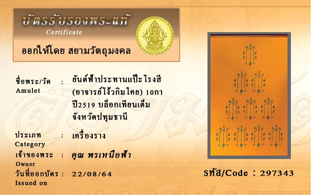 รหัสสินค้า : 297343 ยันต์ฟ้าประทานแป๊ะโรงสี (อาจารย์โง้วกิมโคย) 10กา ปี2519 บล็อกเทียนเต็ม จังหวัดปทุมธานี
