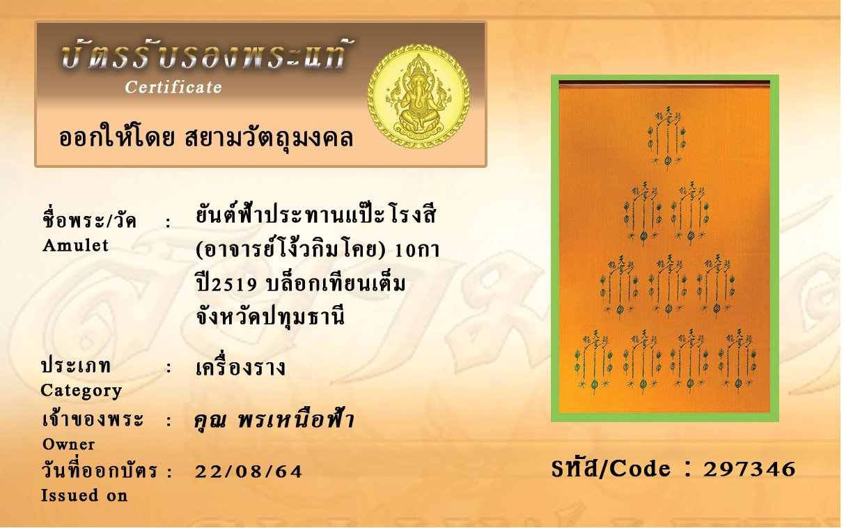 รหัสสินค้า : 297346 ยันต์ฟ้าประทานแป๊ะโรงสี (อาจารย์โง้วกิมโคย) 10กา ปี2519 บล็อกเทียนเต็ม จังหวัดปทุมธานี