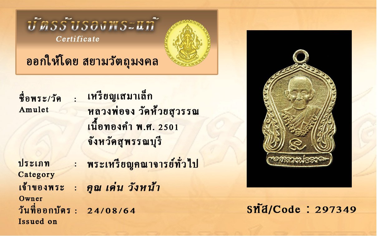 รหัสสินค้า : 297349 เหรียญเสมาเล็ก หลวงพ่อจง วัดห้วยสุวรรณ เนื้อทองคำ พ.ศ. 2501 จังหวัดสุพรรณบุรี