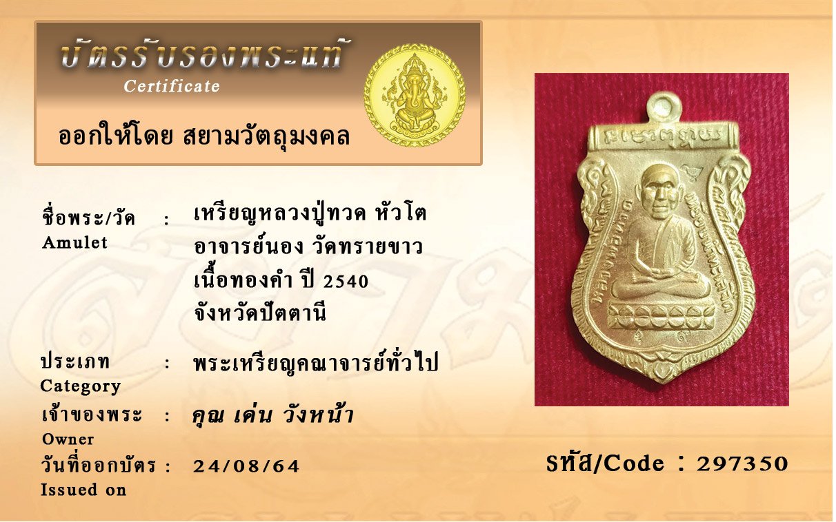 รหัสสินค้า : 297350 เหรียญหลวงปู่ทวด หัวโต อาจารย์นอง วัดทรายขาว เนื้อทองคำ ปี 2540 จังหวัดปัตตานี