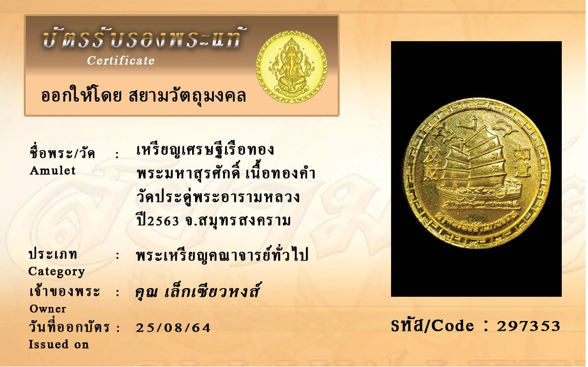รหัสสินค้า : 297353 เหรียญเศรษฐีเรือทอง พระมหาสุรศักดิ์ เนื้อทองคำ วัดประดู่พระอารามหลวง ปี2563 จ.สมุทรสงคราม