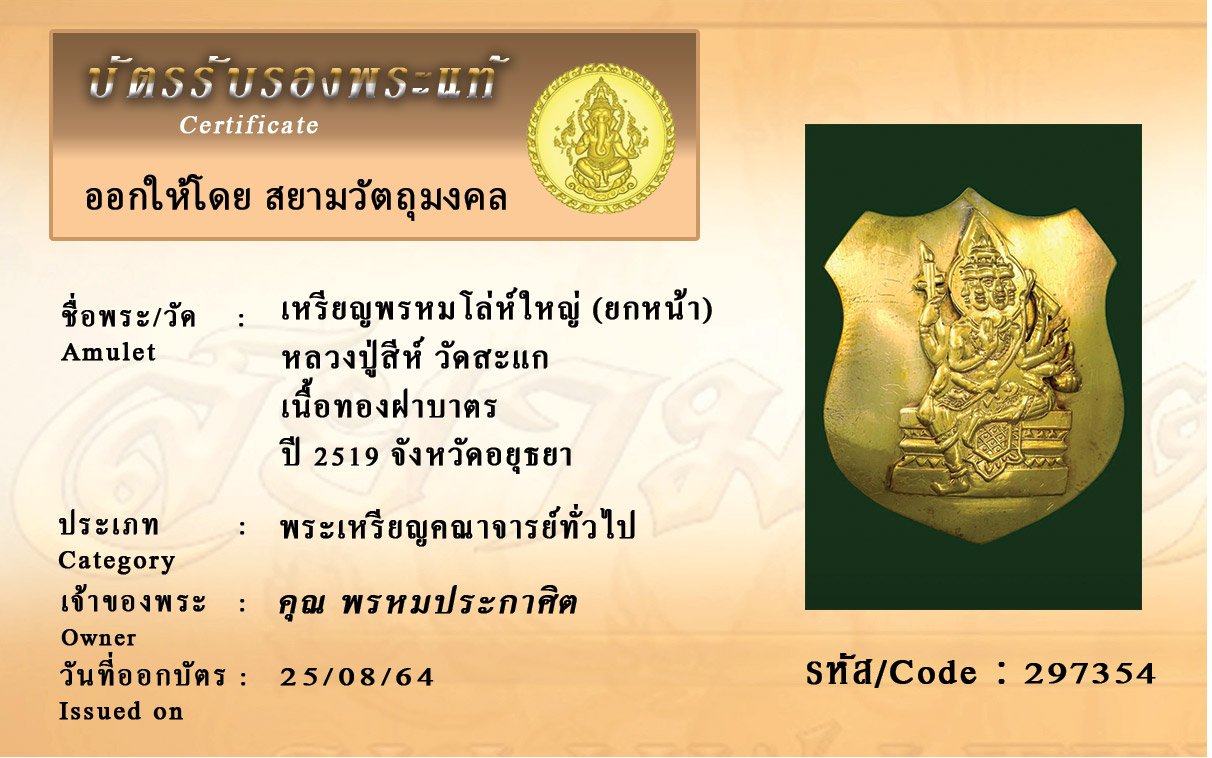 รหัสสินค้า : 297354 เหรียญพรหมโล่ห์ใหญ่ (ยกหน้า) หลวงปู่สีห์ วัดสะแก เนื้อทองฝาบาตร ปี 2519 จังหวัดอยุธยา