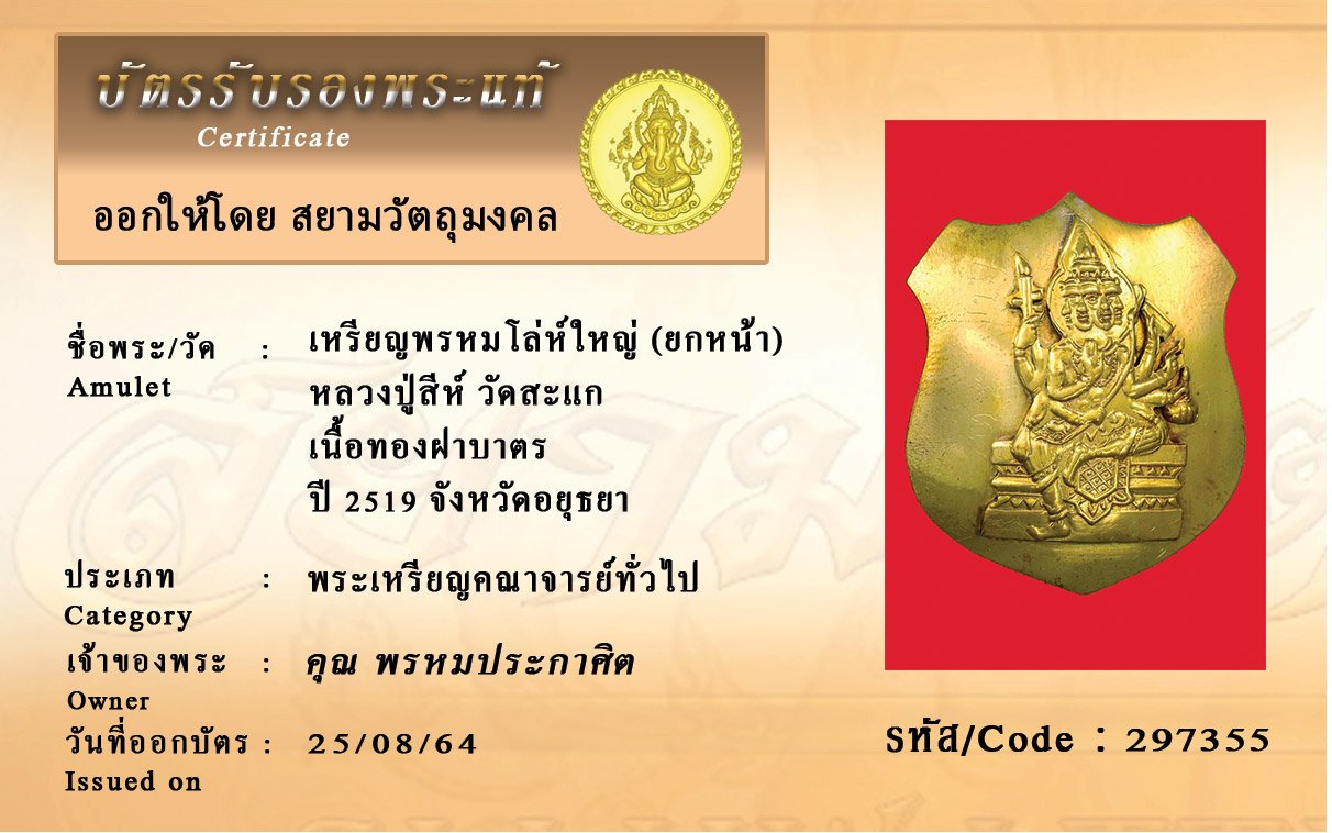 รหัสสินค้า : 297355 เหรียญพรหมโล่ห์ใหญ่ (ยกหน้า) หลวงปู่สีห์ วัดสะแก เนื้อทองฝาบาตร ปี 2519 จังหวัดอยุธยา