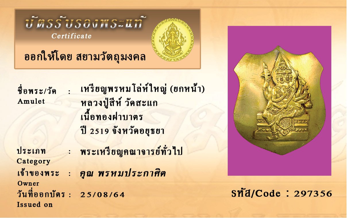 รหัสสินค้า : 297356 เหรียญพรหมโล่ห์ใหญ่ (ยกหน้า) หลวงปู่สีห์ วัดสะแก เนื้อทองฝาบาตร ปี 2519 จังหวัดอยุธยา