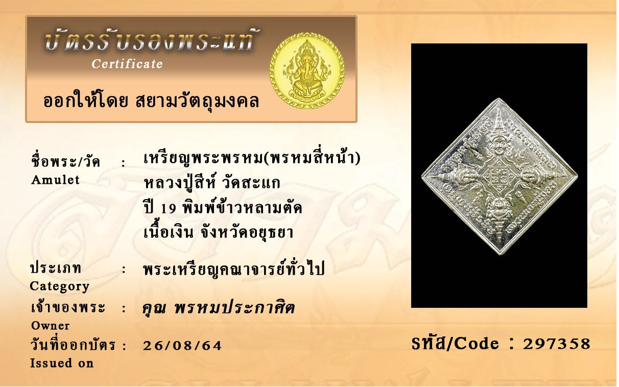 รหัสสินค้า : 297358 เหรียญพระพรหม(พรหมสี่หน้า) หลวงปู่สีห์ วัดสะแก ปี 19 พิมพ์ข้าวหลามตัด เนื้อเงิน จังหวัดอยุธยา