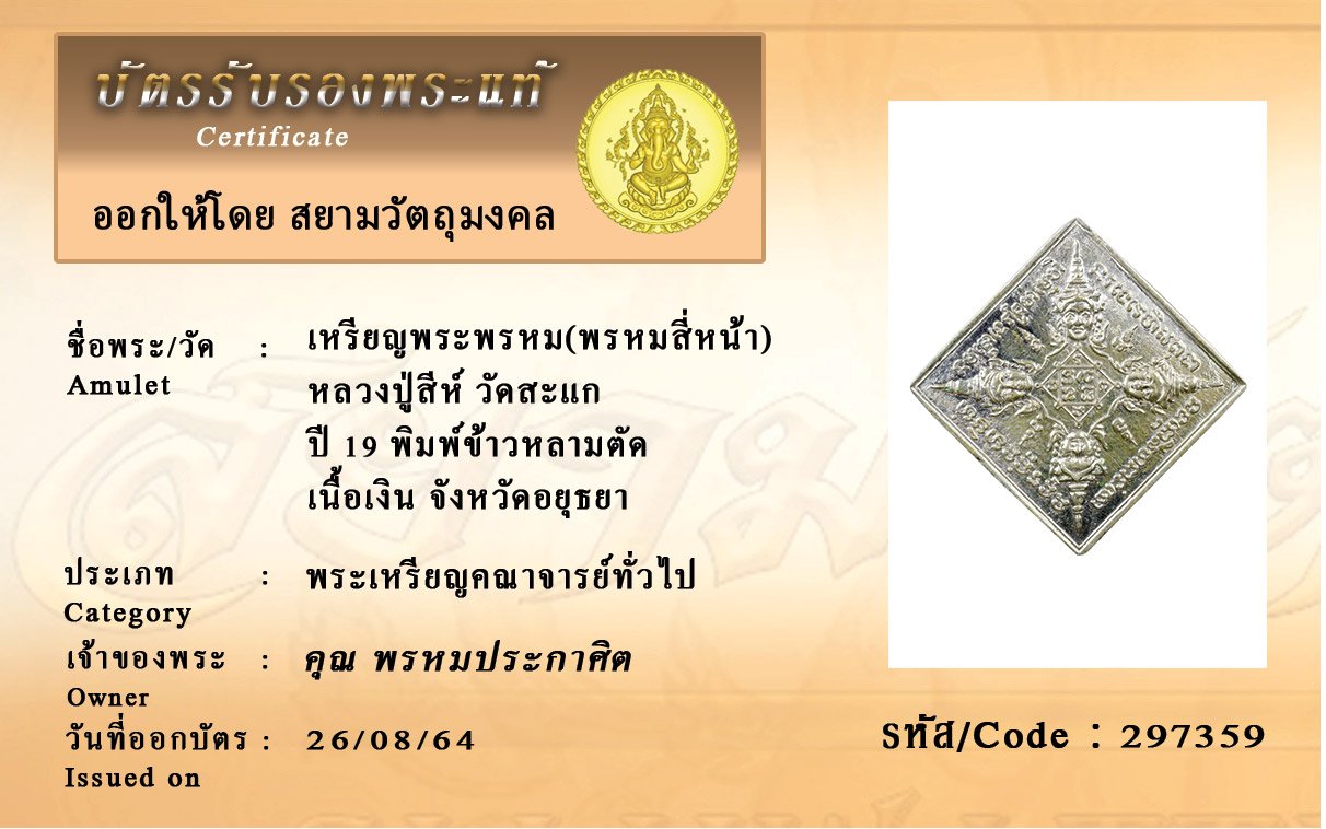 รหัสสินค้า : 297359 เหรียญพระพรหม(พรหมสี่หน้า) หลวงปู่สีห์ วัดสะแก ปี 19 พิมพ์ข้าวหลามตัด เนื้อเงิน จังหวัดอยุธยา