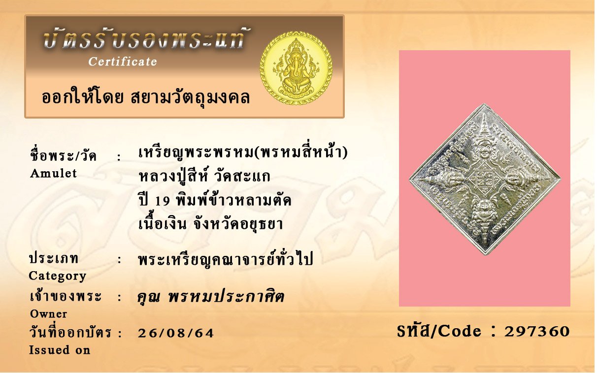 รหัสสินค้า : 297360 เหรียญพระพรหม(พรหมสี่หน้า) หลวงปู่สีห์ วัดสะแก ปี 19 พิมพ์ข้าวหลามตัด เนื้อเงิน จังหวัดอยุธยา