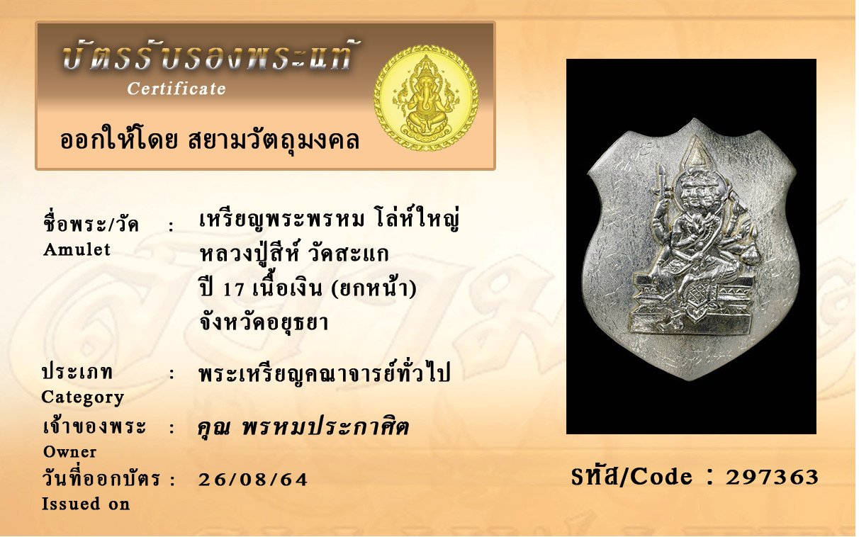 รหัสสินค้า : 297363 เหรียญพระพรหม โล่ห์ใหญ่ หลวงปู่สีห์ วัดสะแก ปี 17 เนื้อเงิน (ยกหน้า) จังหวัดอยุธยา