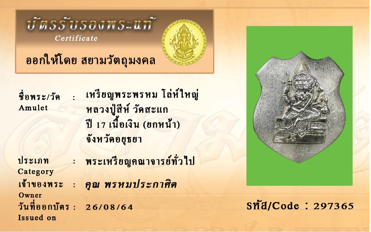 รหัสสินค้า : 297365 เหรียญพระพรหม โล่ห์ใหญ่ หลวงปู่สีห์ วัดสะแก ปี 17 เนื้อเงิน (ยกหน้า) จังหวัดอยุธยา