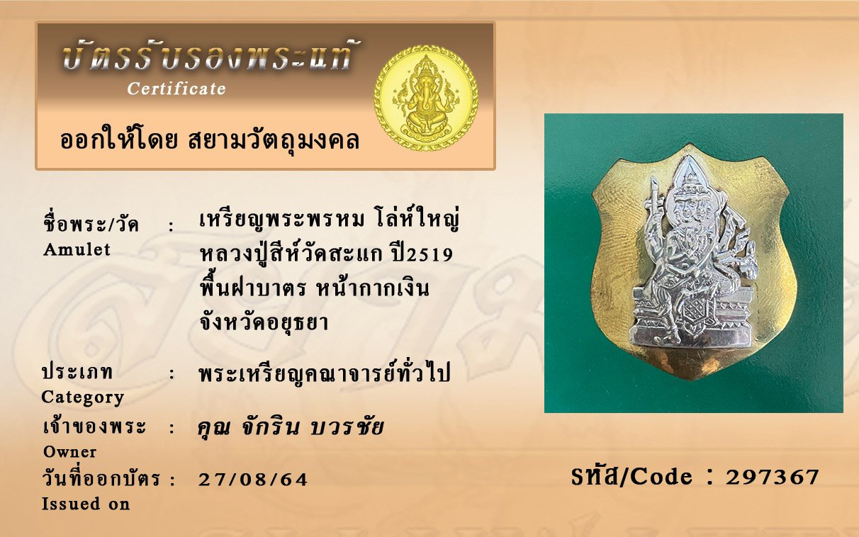 รหัสสินค้า : 297367 เหรียญพระพรหม โล่ห์ใหญ่ หลวงปู่สีห์วัดสะแก ปี2519 พื้นฝาบาตร หน้ากากเงิน จังหวัดอยุธยา