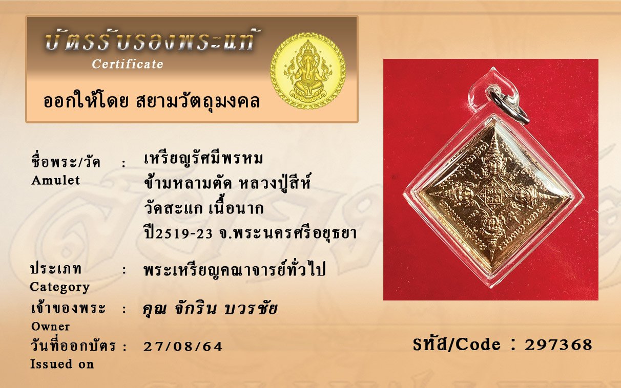 รหัสสินค้า : 297368 เหรียญรัศมีพรหม ข้ามหลามตัด หลวงปู่สีห์ วัดสะแก เนื้อนาก ปี2519-23 จ.พระนครศรีอยุธยา