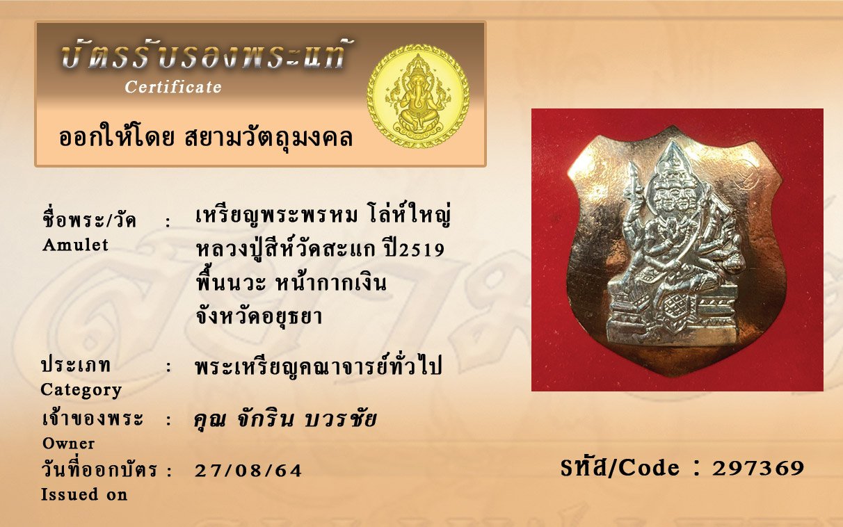 รหัสสินค้า : 297369 เหรียญพระพรหม โล่ห์ใหญ่ หลวงปู่สีห์วัดสะแก ปี2519 พื้นนวะ หน้ากากเงิน จังหวัดอยุธยา