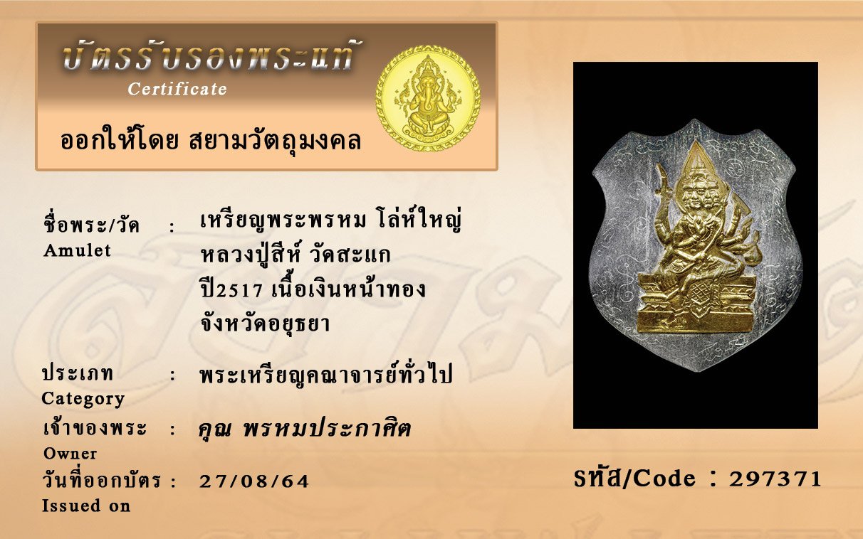 รหัสสินค้า : 297371 เหรียญพระพรหม โล่ห์ใหญ่ หลวงปู่สีห์ วัดสะแก ปี2517 เนื้อเงินหน้าทอง จังหวัดอยุธยา