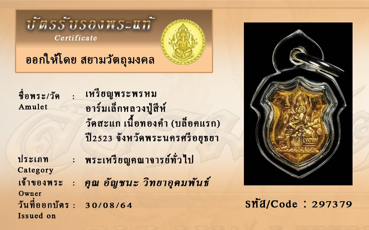 รหัสสินค้า : 297379 เหรียญพระพรหม อาร์มเล็กหลวงปู่สีห์ วัดสะแก เนื้อทองคำ (บล็อคแรก) ปี2523 จังหวัดพระนครศรีอยุธยา