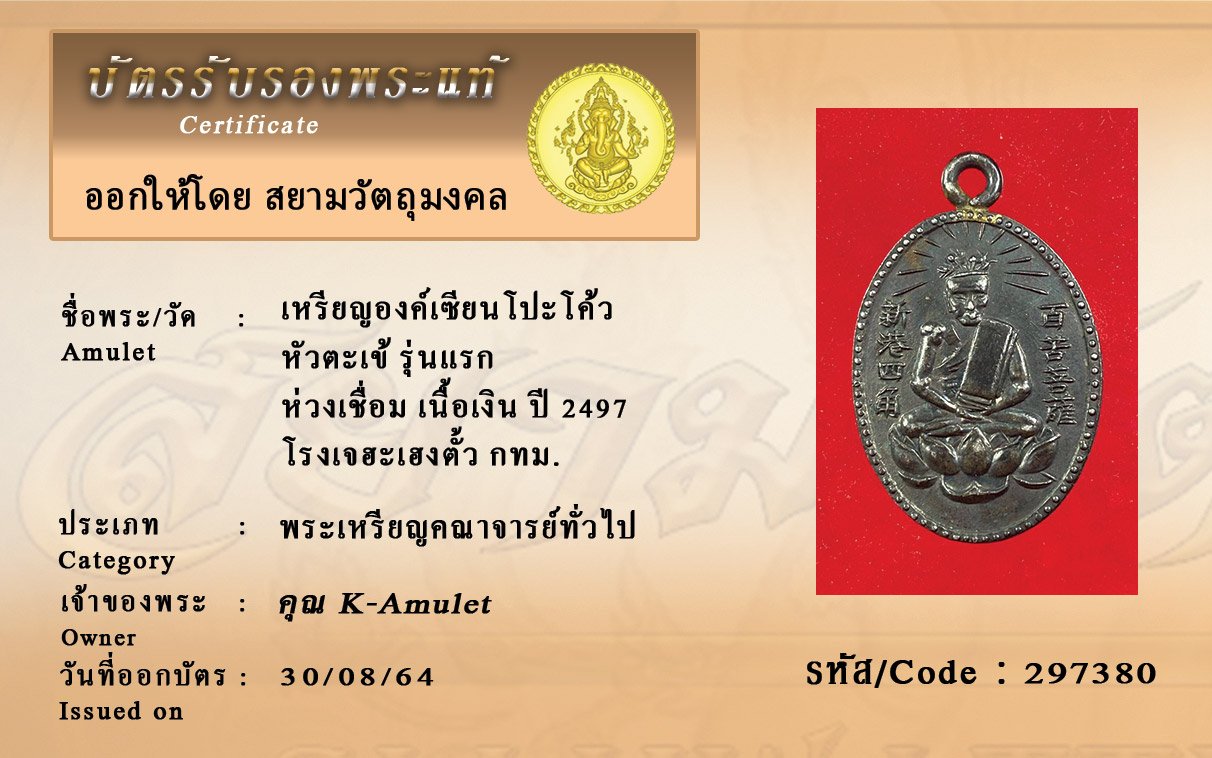 รหัสสินค้า : 297380 เหรียญองค์เซียนโปะโค้ว หัวตะเข้ รุ่นแรก ห่วงเชื่อม เนื้อเงิน ปี 2497 โรงเจฮะเฮงตั้ว กทม.