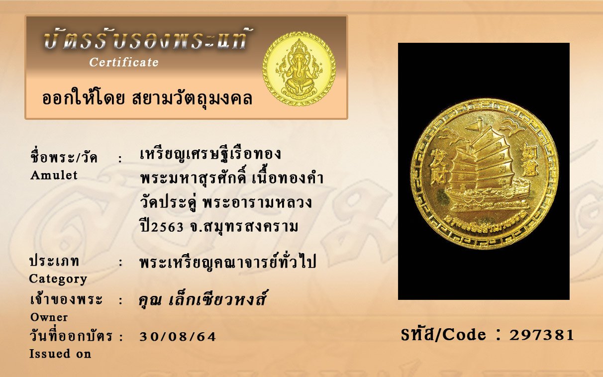 รหัสสินค้า : 297381 เหรียญเศรษฐีเรือทอง พระมหาสุรศักดิ์ เนื้อทองคำ วัดประดู่ พระอารามหลวง ปี2563 จ.สมุทรสงคราม