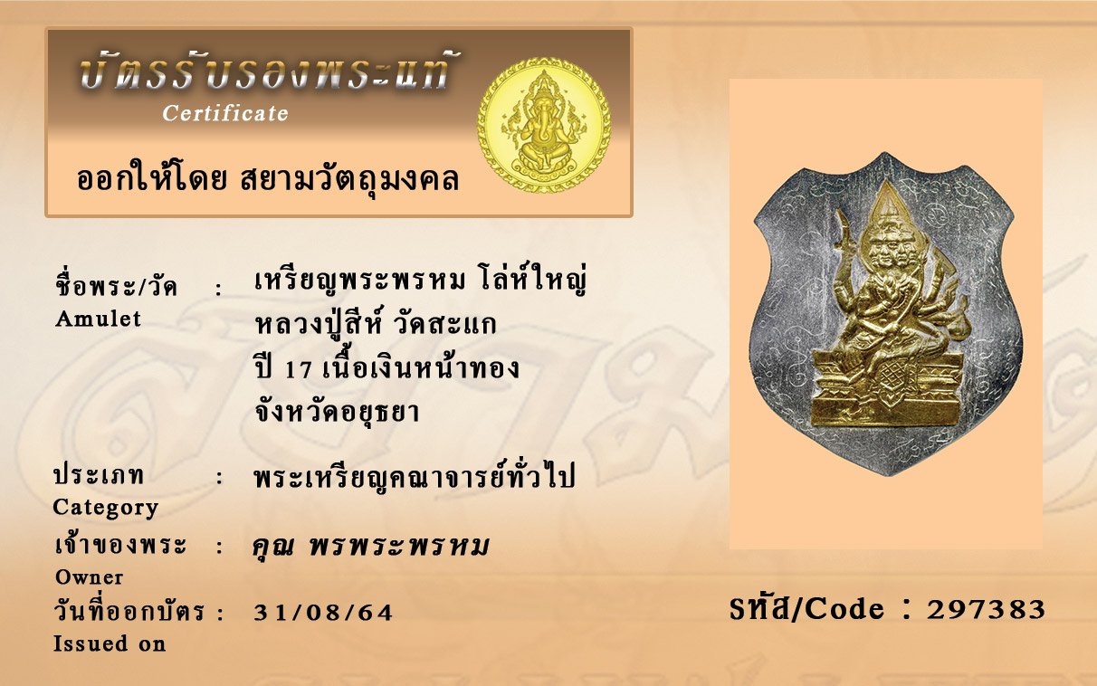 รหัสสินค้า : 297383 เหรียญพระพรหม โล่ห์ใหญ่ หลวงปู่สีห์ วัดสะแก ปี 17 เนื้อเงินหน้าทอง จังหวัดอยุธยา
