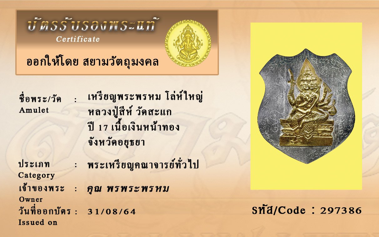 รหัสสินค้า : 297386 เหรียญพระพรหม โล่ห์ใหญ่ หลวงปู่สีห์ วัดสะแก ปี 17 เนื้อเงินหน้าทอง จังหวัดอยุธยา