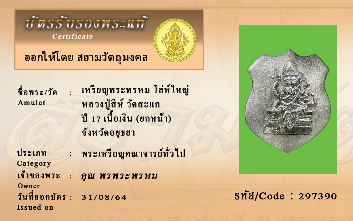 รหัสสินค้า : 297390 เหรียญพระพรหม โล่ห์ใหญ่ หลวงปู่สีห์ วัดสะแก ปี 17 เนื้อเงิน (ยกหน้า) จังหวัดอยุธยา