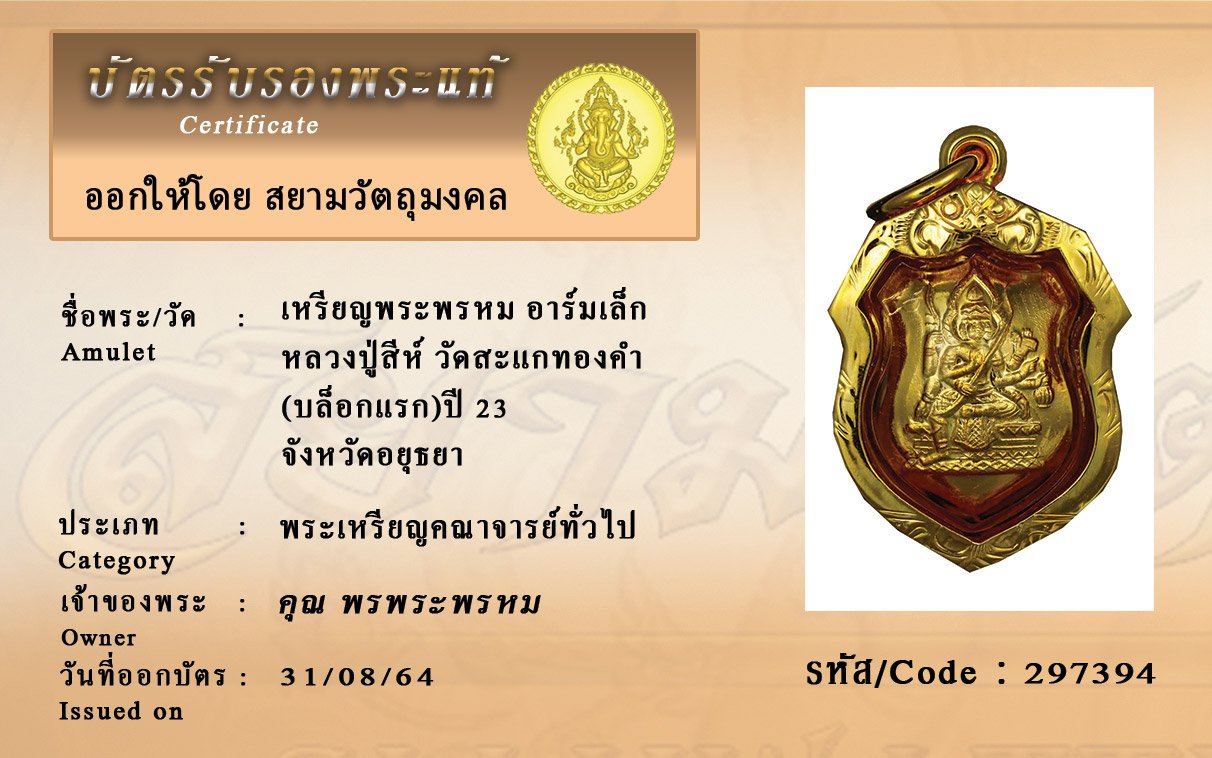 รหัสสินค้า : 297394 เหรียญพระพรหม อาร์มเล็ก หลวงปู่สีห์ วัดสะแกทองคำ (บล็อกแรก)ปี 23 จังหวัดอยุธยา