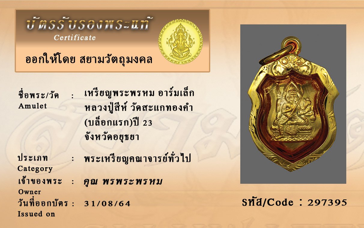 รหัสสินค้า : 297395 เหรียญพระพรหม อาร์มเล็ก หลวงปู่สีห์ วัดสะแกทองคำ (บล็อกแรก)ปี 23 จังหวัดอยุธยา